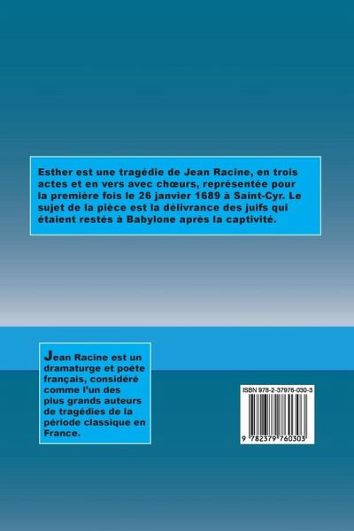 Esther est une tragédie de Jean Racine, en trois actes et en vers avec chœurs, représentée pour la première fois le 26 janvier 1689 à Saint-Cyr. Le sujet de la pièce est la délivrance des juifs qui étaient restés à Babylone après la captivité.