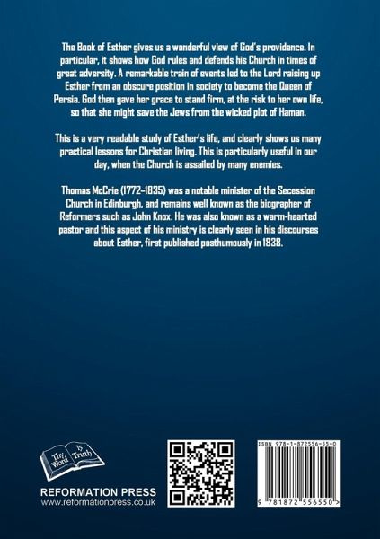 The Book of Esther gives us a wonderful view of God's providence. In particular, it shows how God rules and defends his Church in times of great adversity. A remarkable train of events led to the Lord raising up Esther from an obscure position in society to become the Queen of Persia. God then gave her grace to stand firm, at the risk to her own life, so that she might save the Jews from the wicked plot of Haman. This is a very readable study of Esther's life, and clearly shows us many practical lessons for Christian living. This is particularly useful in our day, when the Church is assailed by many enemies.