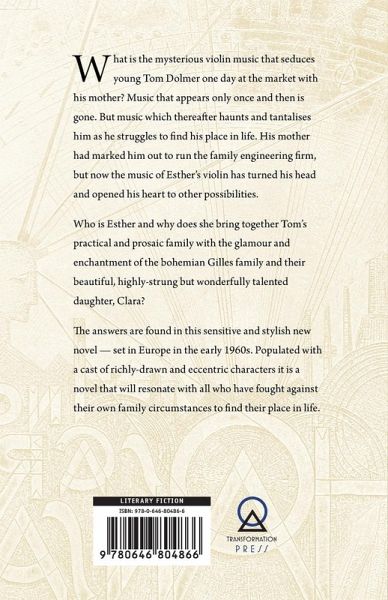 What is the mysterious violin music that seduces young Tom Dolmer one day at the market with his mother? Music that appears only once and then is gone. But music which thereafter haunts and tantalises him as he struggles to find his place in life. His mother had marked him out to run the family engineering firm, but now the music of Esther’s violin has turned his head and opened his heart to other possibilities. Who is Esther and why does she bring together Tom’s practical and prosaic family with the glamour and enchantment of the bohemian Gilles family and their beautiful, highly-strung but wonderfully talented daughter, Clara? The answers are found in this sensitive and stylish new novel — set in Europe in the early 1960s. Populated with a cast of richly-drawn and eccentric characters it is a novel that will resonate with all who have fought against their own family circumstances to find their place in life.