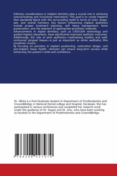 Esthetics considerations in implant dentistry play a crucial role in achieving natural-looking and functional restorations. The goal is to create implants that seamlessly blend with the surrounding teeth in terms of color, shape, size, and overall harmony. Key factors influencing implant aesthetics include proper treatment planning, soft tissue management, bone preservation, and the selection of appropriate prosthetic materials.Advancements in digital dentistry, such as CAD/CAM technology and guided implant placement, have significantly improved aesthetic outcomes. Additionally, the role of pink aesthetics-maintaining healthy and well-contoured gingival tissues-is just as important as white aesthetics (the prosthetic crown).By focusing on precision in implant positioning, restoration design, and peri-implant tissue health, clinicians can ensure long-term success while enhancing the patient's smile and confidence.