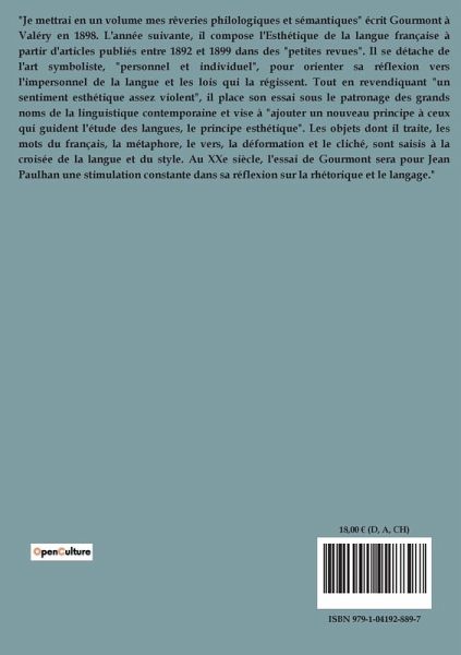"Je mettrai en un volume mes rêveries philologiques et sémantiques" écrit Gourmont à Valéry en 1898. L'année suivante, il compose l'Esthétique de la langue française à partir d'articles publiés entre 1892 et 1899 dans des "petites revues". Il se détache de l'art symboliste, "personnel et individuel", pour orienter sa réflexion vers l'impersonnel de la langue et les lois qui la régissent. Tout en revendiquant "un sentiment esthétique assez violent", il place son essai sous le patronage des grands noms de la linguistique contemporaine et vise à "ajouter un nouveau principe à ceux qui guident l'étude des langues, le principe esthétique". Les objets dont il traite, les mots du français, la métaphore, le vers, la déformation et le cliché, sont saisis à la croisée de la langue et du style. Au XXe siècle, l'essai de Gourmont sera pour Jean Paulhan une stimulation constante dans sa réflexion sur la rhétorique et le langage."