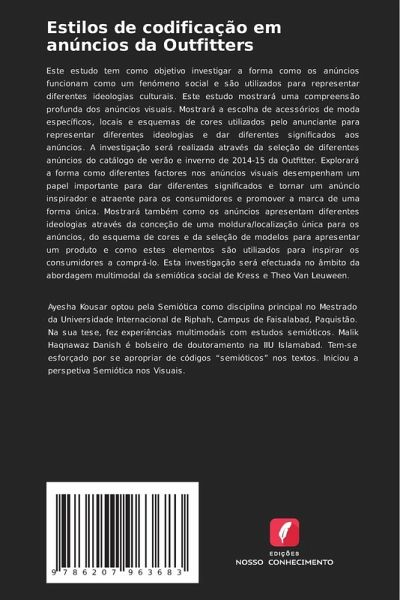 Este estudo tem como objetivo investigar a forma como os anúncios funcionam como um fenómeno social e são utilizados para representar diferentes ideologias culturais. Este estudo mostrará uma compreensão profunda dos anúncios visuais. Mostrará a escolha de acessórios de moda específicos, locais e esquemas de cores utilizados pelo anunciante para representar diferentes ideologias e dar diferentes significados aos anúncios. A investigação será realizada através da seleção de diferentes anúncios do catálogo de verão e inverno de 2014-15 da Outfitter. Explorará a forma como diferentes factores nos anúncios visuais desempenham um papel importante para dar diferentes significados e tornar um anúncio inspirador e atraente para os consumidores e promover a marca de uma forma única. Mostrará também como os anúncios apresentam diferentes ideologias através da conceção de uma moldura/localização única para os anúncios, do esquema de cores e da seleção de modelos para apresentar um produto e como estes elementos são utilizados para inspirar os consumidores a comprá-lo. Esta investigação será efectuada no âmbito da abordagem multimodal da semiótica social de Kress e Theo Van Leuween.