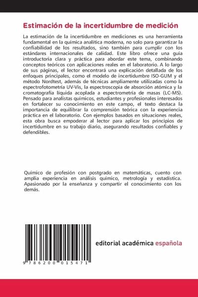La estimación de la incertidumbre en mediciones es una herramienta fundamental en la química analítica moderna, no solo para garantizar la confiabilidad de los resultados, sino también para cumplir con los estándares internacionales de calidad. Este libro ofrece una guía introductoria clara y práctica para abordar este tema, combinando conceptos teóricos con aplicaciones reales en el laboratorio. A lo largo de sus páginas, el lector encontrará una explicación detallada de los enfoques principales, como el modelo de incertidumbre ISO-GUM y el método Nordtest, además de técnicas ampliamente utilizadas como la espectrofotometría UV-Vis, la espectroscopia de absorción atómica y la cromatografía líquida acoplada a espectrometría de masas (LC-MS). Pensado para analistas químicos, estudiantes y profesionales interesados en fortalecer su conocimiento en este campo, el texto destaca la importancia de equilibrar la comprensión teórica con la experiencia práctica en el laboratorio. Con ejemplos basados en situaciones reales, esta obra busca empoderar al lector para aplicar los principios de incertidumbre en su trabajo diario, asegurando resultados confiables y defendibles.