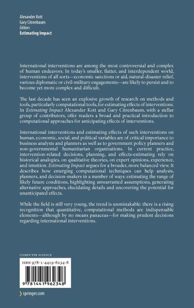 Understanding the potential impact of any action is critical to the success of that action, and in ESTIMATING IMPACT Alexander Kott and Gary Citrenbaum, with a stellar group of contributors, demonstrate how military or humanitarian interventions (or the decision not to intervene) can be rigorously analyzed beforehand and their likely impacts and ramifications predicted at levels appropriate to their scope. A wide range of modeling programs are available that support plan assessment and impact forecast, and they allow accurate prediction within an interdependent set of political, military, economic, social, information, and infrastructure systems, and experts involved in the use and development of these tools demonstrate how, when, and why they should be used.