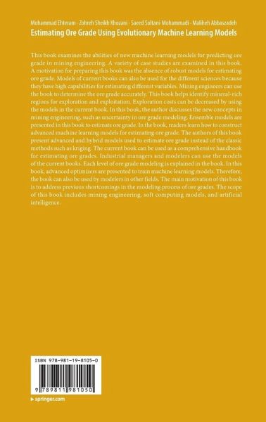 Explains the importance of ore grade estimation.- Reviews machine learning models for ore grade estimation.- Explains the structure of different kinds of machine learning models.- Explains different training algorithms and optimization algorithms. This chapter also explains the structure of evolutionary machine learning models.- Explains the Bayesian model averaging and multilayer perceptron networks for estimating AL2O3 grade in a mine.- Explains the structure of inclusive multiple models and optimized radial basis function neural networks for estimating Sio2 grade in a mine.- Explains the application of hybrid kriging and extreme learning machine models for estimating copper ore grade in a mine.- Explains the application of optimized group machine data handling, support vector machines, and Adaptive neuro-fuzzy interface systems for estimating iron ore grade in mines.- Presents the conclusion, general comments, and suggestions for the next books.