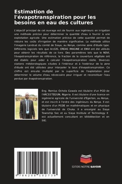 L'objectif principal de cet ouvrage est de fournir aux ingénieurs en irrigation une méthode précise pour déterminer la quantité d'eau à fournir à une exploitation agricole. Une estimation précise de cette quantité permet de réduire les coûts d'irrigation de manière significative. La méthode utilise l'imagerie Landsat du comté de Siaya, au Kenya, comme zone d'étude type. Différents logiciels tels que ArcGIS, ERDAS IMAGINE et ENVI ont été utilisés pour obtenir les résultats de ce livre. Des paramètres tels que le NDVI, l'évapotranspiration de référence, la fraction de la couverture végétale ont été établis pour aider à calculer l'évapotranspiration réelle. Diverses stations météorologiques situées à l'intérieur et à l'extérieur de la zone d'étude ont été utilisées pour interpoler le taux d'évapotranspiration. Ce chiffre est ensuite multiplié par la superficie de l'exploitation pour déterminer le volume d'eau nécessaire pour irriguer et reconstituer l'eau perdue par évapotranspiration.