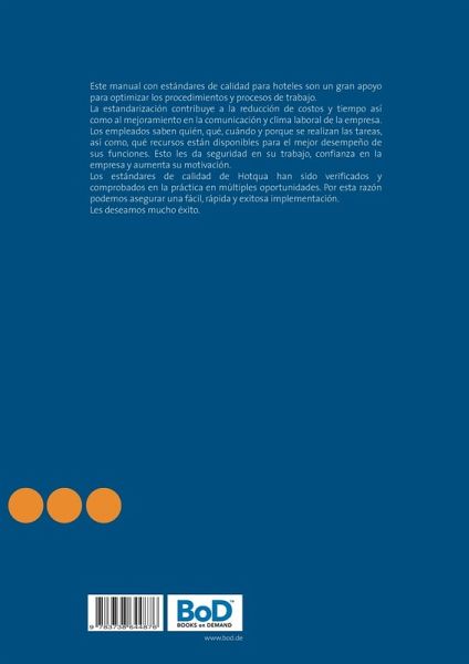 Este manual con estándares de calidad para hoteles son un gran apoyo para optimizar los procedimientos y procesos de trabajo. La estandarización contribuye a la reducción de costos y tiempo así como al mejoramiento en la comunicación y clima laboral de la empresa. Los empleados saben quién, qué, cuándo y porque se realizan las tareas, así como, qué recursos están disponibles para el mejor desempeño de sus funciones. Esto les da seguridad en su trabajo, confianza en la empresa y aumenta su motivación. Los estándares de calidad de Hotqua han sido verificados y comprobados en la práctica en múltiples oportunidades. Por esta razón podemos asegurar una fácil, rápida y exitosa implementación. Les deseamos mucho éxito.