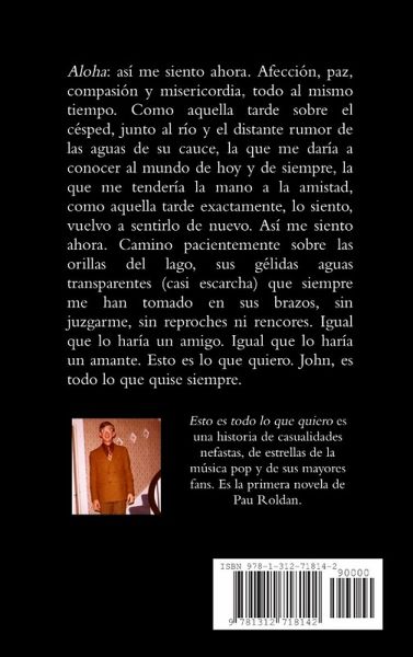 Aloha: así me siento ahora. Afección, paz, compasión y misericordia, todo al mismo tiempo. Como aquella tarde sobre el césped, junto al río y el distante rumor de las aguas de su cauce, la que me daría a conocer al mundo de hoy y de siempre, la que me tendería la mano a la amistad, como aquella tarde exactamente, lo siento, vuelvo a sentirlo de nuevo. Así me siento ahora. Camino pacientemente sobre las orillas del lago, sus gélidas aguas transparentes (casi escarcha) que siempre me han tomado en sus brazos, sin juzgarme, sin reproches ni rencores. Igual que lo haría un amigo. Igual que lo haría un amante. Esto es lo que quiero. John, es todo lo que quise siempre. "Esto es todo lo que quiero" es la historia de Dick Harford, un individuo desdichado y malnacido que tuvo que huir de Detroit a finales de los años sesenta y que se embarca en una aventura de casualidades en la que él es el culpable de todo sin querer serlo de nada. Y en su camino se cruza Nemo, alguien que detesta la música pop.