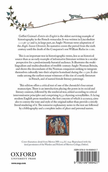 Estoire des Engleis is a rhymed chronicle of English history written in the British Isles in the 12th century. It is the oldest surviving example of historiography in the French vernacular, and is presented here in full with a facing-page translation in modern English prose and extensive explanatory notes.