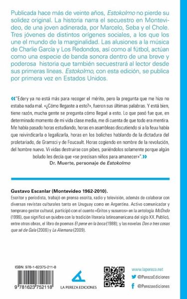 Publicada hace más de veinte años, Estokolmo no pierde su solidez original. La historia narra el secuestro en Montevideo, de una joven adinerada, por Marcelo, Seba y el Chole. Tres jóvenes de distintos orígenes sociales, a los que los une el mundo de la marginalidad. Las alusiones a la música de Charlie García y Los Redondos, así como al fútbol, actúan como una especie de banda sonora dentro de una breve y poderosa historia que también secuestrará al lector desde sus primeras líneas. Estokolmo, con esta edición, se publica por primera vez en Estados Unidos.