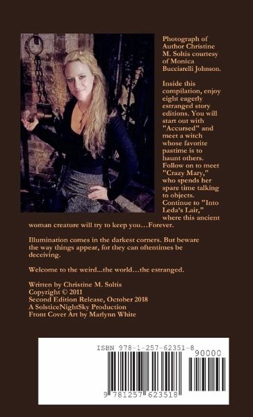 Photograph of Author Christine M. Soltis courtesy of Monica Bucciarelli Johnson. Inside this compilation, enjoy eight eagerly estranged story editions. You will start out with "Accursed" and meet a witch whose favorite pastime is to haunt others. Follow on to meet "Crazy Mary," who spends her spare time talking to objects. Continue to "Into Leda's Lair," where this ancient woman creature will try to keep you...Forever. Illumination comes in the darkest corners. But beware the way things appear, for they can oftentimes be deceiving. Welcome to the weird...the world...the estranged. Written by Christine M. Soltis Copyright (c) 2011 Second Edition Release, October 2018 A SolsticeNightSky Production Front Cover Art by Marlynn White