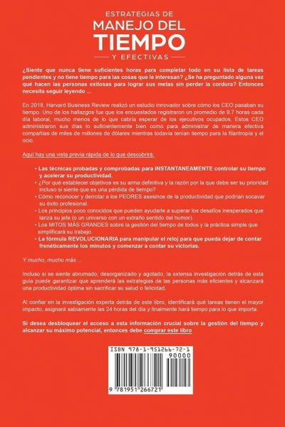 ¿Siente que nunca tiene suficientes horas para completar todo en su lista de tareas pendientes y no tiene tiempo para las cosas que le interesan? ¿Se ha preguntado alguna vez qué hacen las personas exitosas para lograr sus metas sin perder la cordura? Entonces necesita seguir leyendo ... En 2018, Harvard Business Review realizó un estudio innovador sobre cómo los CEO pasaban su tiempo. Uno de los hallazgos fue que los encuestados registraron un promedio de 9.7 horas cada día laboral, mucho menos de lo que cabría esperar de los ejecutivos ocupados. Estos CEO administraron sus días lo suficientemente bien como para administrar de manera efectiva compañías de miles de millones de dólares mientras todavía tenían tiempo para la filantropía y el ocio. Aquí hay una vista previa rápida de lo que descubrirá: Las técnicas probadas y comprobadas para INSTANTANEAMENTE controlar su tiempo y acelerar su productividad. ¿Por qué establecer objetivos es su arma definitiva y la razón por la que debe ser su prioridad incluso si siente que es una pérdida de tiempo? Cómo reconocer y derrotar a los PEORES asesinos de la productividad que podrían socavar su éxito profesional. Los principios poco conocidos que pueden ayudarle a superar los desafíos inesperados que lanza su jefe (o un universo con un extraño sentido del humor). Los MITOS MÁS GRANDES sobre la gestión del tiempo de todos y la práctica simple que simplificará su trabajo. La fórmula REVOLUCIONARIA para manipular el reloj para que pueda dejar de contar frenéticamente los minutos y comenzar a contar su victorias. Y mucho, mucho más ... Incluso si se siente abrumado, desorganizado y agotado, la extensa investigación detrás de esta guía puede garantizar que aprenderá las estrategias de las personas más eficientes y alcanzará una productividad óptima sin sacrificar su salud o felicidad. Al confiar en la investigación experta detrás de este libro, identificará qué tareas tienen el mayor impacto, asignará sabiamente las 24 horas del día y finalmente hará tiempo para lo que importa. Si desea desbloquear el acceso a esta información crucial sobre la gestión del tiempo y alcanzar su máximo potencial, entonces debe comprar este libro