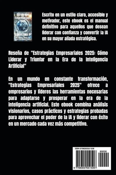 Reseña de "Estrategias Empresariales 2025: Cómo Liderar y Triunfar en la Era de la Inteligencia Artificial" En un mundo en constante transformación, "Estrategias Empresariales 2025" ofrece a empresarios y líderes las herramientas necesarias para adaptarse y prosperar en la era de la inteligencia artificial. Este ebook combina análisis visionarios, casos prácticos y estrategias probadas para aprovechar el poder de la IA y liderar con éxito en un mercado cada vez más competitivo. Desde la automatización de procesos hasta la personalización masiva, el libro desglosa conceptos complejos en pasos prácticos que cualquier empresa, sin importar su tamaño, puede implementar. Además, aborda cómo transformar desafíos tecnológicos en oportunidades, construir equipos resilientes y mantenerse a la vanguardia de la innovación. Escrito en un estilo claro, accesible y motivador, este ebook es el manual definitivo para aquellos que desean liderar con confianza y convertir la IA en su mayor aliada estratégica.