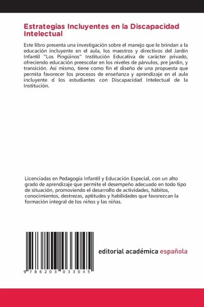 Este libro presenta una investigación sobre el manejo que le brindan a la educación incluyente en el aula, los maestros y directivos del Jardín Infantil "Los Pingüinos" Institución Educativa de carácter privado, ofreciendo educación preescolar en los niveles de párvulos, pre jardín, y transición. Así mismo, tiene como fin el diseño de una propuesta que permita favorecer los procesos de enseñanza y aprendizaje en el aula incluyente d los estudiantes con Discapacidad Intelectual de la Institución.