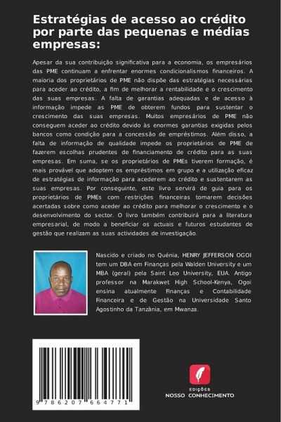 Apesar da sua contribuição significativa para a economia, os empresários das PME continuam a enfrentar enormes condicionalismos financeiros. A maioria dos proprietários de PME não dispõe das estratégias necessárias para aceder ao crédito, a fim de melhorar a rentabilidade e o crescimento das suas empresas. A falta de garantias adequadas e de acesso à informação impede as PME de obterem fundos para sustentar o crescimento das suas empresas. Muitos empresários de PME não conseguem aceder ao crédito devido às enormes garantias exigidas pelos bancos como condição para a concessão de empréstimos. Além disso, a falta de informação de qualidade impede os proprietários de PME de fazerem escolhas prudentes de financiamento de crédito para as suas empresas. Em suma, se os proprietários de PMEs tiverem formação, é mais provável que adoptem os empréstimos em grupo e a utilização eficaz de estratégias de informação para acederem ao crédito e sustentarem as suas empresas. Por conseguinte, este livro servirá de guia para os proprietários de PMEs com restrições financeiras tomarem decisões acertadas sobre como aceder ao crédito para melhorar o crescimento e o desenvolvimento do sector. O livro também contribuirá para a literatura empresarial, de modo a beneficiar os actuais e futuros estudantes de gestão que realizam as suas actividades de investigação.