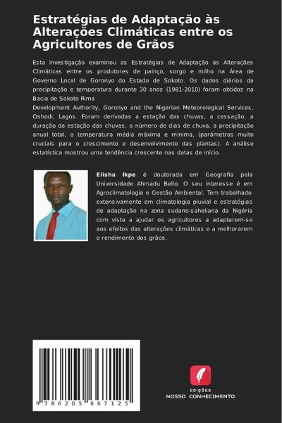 Esta investigação examinou as Estratégias de Adaptação às Alterações Climáticas entre os produtores de painço, sorgo e milho na Área de Governo Local de Goronyo do Estado de Sokoto. Os dados diários da precipitação e temperatura durante 30 anos (1981-2010) foram obtidos na Bacia de Sokoto RimaDevelopment Authority, Goronyo and the Nigerian Meteorological Services, Oshodi, Lagos. Foram derivadas a estação das chuvas, a cessação, a duração da estação das chuvas, o número de dias de chuva, a precipitação anual total, a temperatura média máxima e mínima, (parâmetros muito cruciais para o crescimento e desenvolvimento das plantas). A análise estatística mostrou uma tendência crescente nas datas de início.