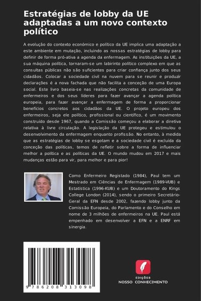 A evolução do contexto económico e político da UE implica uma adaptação a este ambiente em mutação, incluindo as nossas estratégias de lobby para definir de forma pró-ativa a agenda da enfermagem. As instituições da UE, a sua máquina política, tornaram-se um labirinto político complexo em que as consultas públicas não são suficientes para criar confiança junto dos seus cidadãos. Colocar a sociedade civil na nuvem para se reunir e produzir declarações é a nova fachada que não facilita a conceção de uma Europa social. Este livro baseia-se nas realizações concretas da comunidade de enfermeiros e dos seus líderes para fazer avançar a agenda política europeia, para fazer avançar a enfermagem de forma a proporcionar benefícios concretos aos cidadãos da UE. O projeto europeu dos enfermeiros, seja ele político, profissional ou científico, é um movimento construído desde 1967, quando a Comissão começou a elaborar a diretiva relativa à livre circulação. A legislação da UE protegeu e estimulou o desenvolvimento da enfermagem enquanto profissão. No entanto, à medida que as estratégias de lobby se esgotam e a sociedade civil é excluída da conceção das políticas, temos de refletir sobre a forma de influenciar melhor a política e as políticas da UE. O mundo mudou em 2017 e mais mudanças estão para vir, para melhor e para pior!