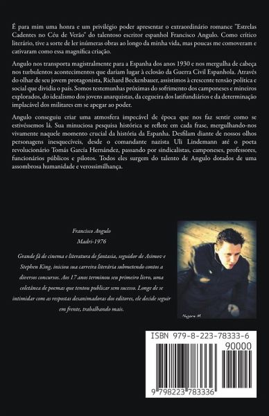 É para mim uma honra e um privilégio poder apresentar o extraordinário romance "Estrelas Cadentes no Céu de Verão" do talentoso escritor espanhol Francisco Angulo. Como crítico literário, tive a sorte de ler inúmeras obras ao longo da minha vida, mas poucas me comoveram e cativaram como essa magnífica criação. Angulo nos transporta magistralmente para a Espanha dos anos 1930 e nos mergulha de cabeça nos turbulentos acontecimentos que dariam lugar à eclosão da Guerra Civil Espanhola. Através do olhar de seu jovem protagonista, Richard Beckenbauer, assistimos à crescente tensão política e social que dividia o país. Somos testemunhas próximas do sofrimento dos camponeses e mineiros explorados, do idealismo dos jovens anarquistas, da cegueira dos latifundiários e da determinação implacável dos militares em se apegar ao poder. Angulo conseguiu criar uma atmosfera impecável de época que nos faz sentir como se estivéssemos lá. Sua minuciosa pesquisa histórica se reflete em cada frase, mergulhando-nos vivamente naquele momento crucial da história da Espanha. Desfilam diante de nossos olhos personagens inesquecíveis, desde o comandante nazista Uli Lindemann até o poeta revolucionário Tomás García Hernández, passando por sindicalistas, camponeses, professores, funcionários públicos e pilotos. Todos eles surgem do talento de Angulo dotados de uma assombrosa humanidade e verossimilhança. Mas a grandeza desta obra vai muito além de sua magistral recriação histórica. Em essência, é uma comovente história de amor e redenção. A relação clandestina entre Richard e Tomás, dois jovens de mundos opostos irremediavelmente atraídos, torna-se uma metáfora de tudo aquilo que une os seres humanos para além das diferenças. Através deles exploramos temas universais como a busca pela identidade, a luta entre o dever e os sentimentos, o conflito entre o racional e o passional. Seus encontros furtivos em praias desertas, seus olhares cúmplices, o fogo de seu amor proibido, tudo isso é descrito por Angulo com exímia delicadeza, sem jamais recorrer à pieguice. O despertar sexual e sentimental de Richard simboliza também seu despertar moral e político. Pouco a pouco, ele se dá conta da manipulação da qual foi objeto e decide agir motivado por sua consciência. A revelação da verdade sobre as minas de ouro que seu país está saqueando para financiar a guerra desperta nele um imperativo moral de impedi-lo.