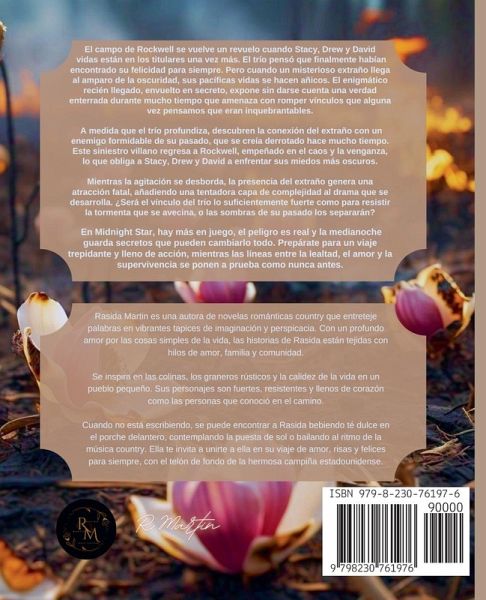 Estrella de medianoche: Un thriller romántico de vaqueros En la tranquila campiña de Rockwell, la llegada de un misterioso extraño desencadena una reacción en cadena de secretos, mentiras y venganza mortal. Para Stacy, Drew y David, su felicidad para siempre se hace añicos y sus vidas vuelven a aparecer en los titulares. A medida que profundizan, descubren una verdad enterrada hace mucho tiempo que amenaza con destruir sus vínculos y enfrentar sus miedos más oscuros. Con un formidable enemigo de su pasado empeñado en el caos y la venganza, el trío debe luchar para sobrevivir. Pero en medio de la confusión, surge una atracción fatal, que añade una tentadora capa de complejidad al drama que se desarrolla. ¿Serán suficientes su lealtad y amor para resistir la tormenta que se avecina? Sumérgete en este emocionante viaje lleno de acción, donde hay más en juego que nunca. En estrella de medianoche, la medianoche guarda secretos que pueden cambiarlo todo. Género: Western contemporáneo, Suspense romántico, Romance de suspenso Occidental contemporáneo: - vaquero - Rancho - Rural - Pueblo pequeño - País - Romance occidental Romance de suspenso: - Suspenso romántico - Suspense doméstico - Acción/Aventura Tropos:Romance de pueblo pequeño Héroes vaqueros/campesinos Romance del club de motociclistas/Héroe de MMC Romance vaquero Heroína damisela en apuros Familia encontrada Especia dulce Romance de acción buenas bromas Suspense BIEN