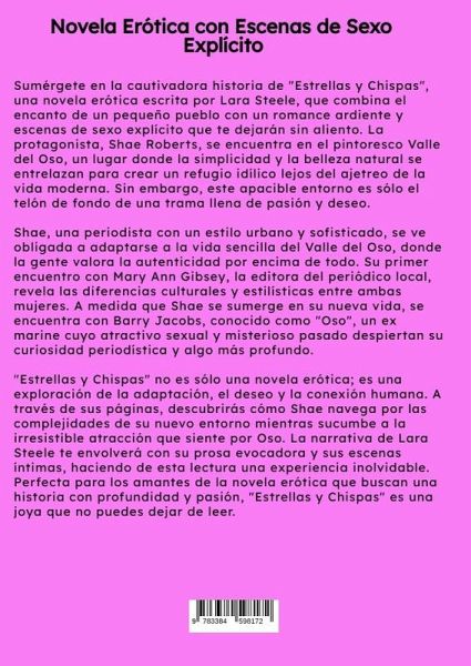 Sumérgete en la cautivadora historia de "Estrellas y Chispas", una novela erótica escrita por Lara Steele, que combina el encanto de un pequeño pueblo con un romance ardiente y escenas de sexo explícito que te dejarán sin aliento. La protagonista, Shae Roberts, se encuentra en el pintoresco Valle del Oso, un lugar donde la simplicidad y la belleza natural se entrelazan para crear un refugio idílico lejos del ajetreo de la vida moderna. Sin embargo, este apacible entorno es sólo el telón de fondo de una trama llena de pasión y deseo.Shae, una periodista con un estilo urbano y sofisticado, se ve obligada a adaptarse a la vida sencilla del Valle del Oso, donde la gente valora la autenticidad por encima de todo. Su primer encuentro con Mary Ann Gibsey, la editora del periódico local, revela las diferencias culturales y estilísticas entre ambas mujeres. A medida que Shae se sumerge en su nueva vida, se encuentra con Barry Jacobs, conocido como "Oso", un ex marine cuyo atractivo sexualy misterioso pasado despiertan su curiosidad periodística y algo más profundo."Estrellas y Chispas" no es sólo una novela erótica; es una exploración de la adaptación, el deseo y la conexión humana. A través de sus páginas, descubrirás cómo Shae navega por las complejidades de su nuevo entorno mientras sucumbe a la irresistible atracción que siente por Oso. La narrativa de Lara Steele te envolverá con su prosa evocadora y sus escenas íntimas, haciendo de esta lectura una experiencia inolvidable. Perfecta para los amantes de la novela erótica que buscan una historia con profundidad y pasión, "Estrellas y Chispas" es una joya que no puedes dejar de leer.