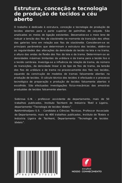 O trabalho é dedicado à estrutura, conceção e tecnologia de produção de tecidos abertos para a parte superior de palmilhas de calçado. São analisados os meios de ligação existentes. Desenvolve-se o meio leno de reduzir a tensão dos fios de stockinette no momento da transição dos olhos das galerias leno em relação aos fios de stockinette. Consideram-se os principais parâmetros que determinam a estrutura dos tecidos, obtêm-se as regularidades das alterações da densidade do tecido na teia e na trama, a altura das ondas de flexão dos fios da teia e da trama. Determinam-se as densidades máximas limitantes da urdidura e da trama para o tecido liso e o tecido cambraia. Investiga-se a influência da relação de trama, do número de transições, da densidade linear e do tipo de fios de trama, da tensão dos fios de urdidura e de trama no processamento dos fios nos tecidos, aquando da construção de modelos de tramas falsamente abertas na produção de tecidos. O cálculo técnico dos tecidos é efectuado e o processo tecnológico de preparação e produção de tecidos falsamente abertos é escolhido. São efectuadas investigações físico-mecânicas das amostras produzidas de tecidos falsamente abertos.