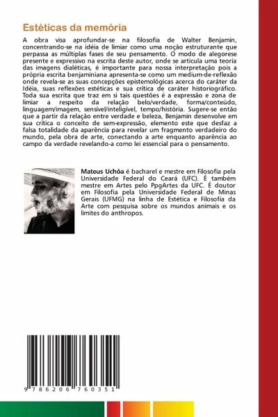 A obra visa aprofundar-se na filosofia de Walter Benjamin, concentrando-se na idéia de limiar como uma noção estruturante que perpassa as múltiplas fases de seu pensamento. O modo de alegorese presente e expressivo na escrita deste autor, onde se articula uma teoria das imagens dialéticas, é importante para nossa interpretação pois a própria escrita benjaminiana apresenta-se como um medium-de-reflexão onde revela-se as suas concepções epistemológicas acerca do caráter da Idéia, suas reflexões estéticas e sua crítica de caráter historiográfico. Toda sua escrita que traz em si tais questões é a expressão e zona de limiar a respeito da relação belo/verdade, forma/conteúdo, linguagem/imagem, sensível/inteligível, tempo/história. Sugere-se então que a partir da relação entre verdade e beleza, Benjamin desenvolve em sua crítica o conceito de sem-expressão, elemento este que desfaz a falsa totalidade da aparência para revelar um fragmento verdadeiro do mundo, pela obra de arte, conectando a arte enquanto aparência ao campo da verdade revelando-a como lei essencial para o pensamento.