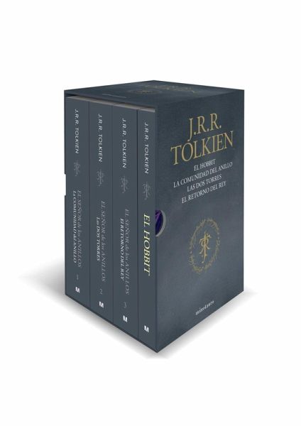 Un pack con las 4 obras maestras de Tolkien. El Hobbit Smaug parecía profundamente dormido cuando Bilbo espió una vez más desde la entrada. ¡Pero fingía! ¡Estaba vigilando la entrada del túnel!... Sacado de su cómodo agujero-hobbit por Gandalf y una banda de enanos, Bilbo se encuentra de pronto en medio de una conspiración que pretende apoderarse del tesoro de Smaug el Magnífico, un enorme y muy peligroso dragón... El Señor de los Anillos. La Comunidad del Anillo En la adormecida e idílica Comarca, un joven hobbit recibe un encargo: custodiar el Anillo Único y emprender el viaje para su destrucción en la Grieta del Destino. Acompañado por magos, hombres, elfos y enanos, atravesará la Tierra Media y se internará en las sombras de Mordor, perseguido siempre por las huestes de Sauron, el Señor Oscuro, dispuesto a recuperar su creación para establecer el dominio definitivo del Mal. El Señor de los Anillos. Las Dos Torres La Compañía se ha disuelto y sus integrantes emprenden caminos separados. Frodo y Sam avanzan solos en su viaje a lo largo del río Anduin, perseguidos por la sombra misteriosa de un ser extraño que también ambiciona la posesión del Anillo. Mientras, hombres, elfos y enanos se preparan para la batalla final contra las fuerzas del Señor del Mal. El Señor de los Anillos. El Retorno del Rey Los ejércitos del Señor Oscuro van extendiendo cada vez más su maléfica sombra por la Tierra Media. Hombres, elfos y enanos unen sus fuerzas para presentar batalla a Sauron y sus huestes. Ajenos a estos preparativos, Frodo y Sam siguen adentrándose en el país de Mordor en su heroico viaje para destruir el Anillo de Poder en las Grietas del Destino. Incluye las ediciones revisadas en rústica. Nueva edición del estuche que incluye El Hobbit y los tres volúmenes de la trilogía El Señor de los Anillos.