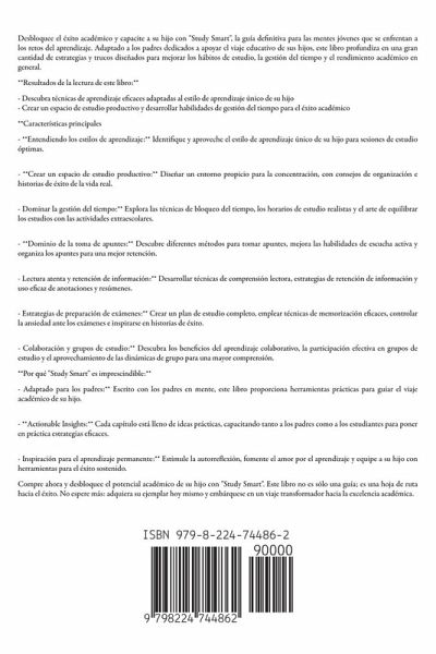 Desbloquee el éxito académico y capacite a su hijo con "Study Smart", la guía definitiva para las mentes jóvenes que se enfrentan a los retos del aprendizaje. Adaptado a los padres dedicados a apoyar el viaje educativo de sus hijos, este libro profundiza en una gran cantidad de estrategias y trucos diseñados para mejorar los hábitos de estudio, la gestión del tiempo y el rendimiento académico en general. **Resultados de la lectura de este libro:** - Descubra técnicas de aprendizaje eficaces adaptadas al estilo de aprendizaje único de su hijo - Crear un espacio de estudio productivo y desarrollar habilidades de gestión del tiempo para el éxito académico **Características principales - **Entendiendo los estilos de aprendizaje:** Identifique y aproveche el estilo de aprendizaje único de su hijo para sesiones de estudio óptimas. - **Crear un espacio de estudio productivo:** Diseñar un entorno propicio para la concentración, con consejos de organización e historias de éxito de la vida real. - Dominar la gestión del tiempo:** Explora las técnicas de bloqueo del tiempo, los horarios de estudio realistas y el arte de equilibrar los estudios con las actividades extraescolares. - **Dominio de la toma de apuntes:** Descubre diferentes métodos para tomar apuntes, mejora las habilidades de escucha activa y organiza los apuntes para una mejor retención. - Lectura atenta y retención de información:** Desarrollar técnicas de comprensión lectora, estrategias de retención de información y uso eficaz de anotaciones y resúmenes. - Estrategias de preparación de exámenes:** Crear un plan de estudio completo, emplear técnicas de memorización eficaces, controlar la ansiedad ante los exámenes e inspirarse en historias de éxito. - Colaboración y grupos de estudio:** Descubra los beneficios del aprendizaje colaborativo, la participación efectiva en grupos de estudio y el aprovechamiento de las dinámicas de grupo para una mayor comprensión. **Por qué "Study Smart" es imprescindible:** - Adaptado para los padres:** Escrito con los padres en mente, este libro proporciona herramientas prácticas para guiar el viaje académico de su hijo. - **Actionable Insights:** Cada capítulo está lleno de ideas prácticas, capacitando tanto a los padres como a los estudiantes para poner en práctica estrategias eficaces. - Inspiración para el aprendizaje permanente:** Estimule la autorreflexión, fomente el amor por el aprendizaje y equipe a su hijo con herramientas para el éxito sostenido. Compre ahora y desbloquee el potencial académico de su hijo con "Study Smart". Este libro no es sólo una guía; es una hoja de ruta hacia el éxito. No espere más: adquiera su ejemplar hoy mismo y embárquese en un viaje transformador hacia la excelencia académica.