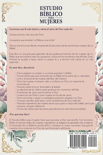 Construya una fe más fuerte y sienta el amor de Dios cada día ¿Desea sentirse más cerca de Dios? ¿Le parece que estudiar La Biblia es una lucha? ¿Busca una forma sencilla de comprender las lecciones de las asombrosas mujeres de La Biblia? Este libro es una guía para aprender de las poderosas historias de las mujeres de La Biblia, que encontraron valor, fe y propósito, incluso en los momentos más difíciles. Estas historias le ayudan a hacer crecer su propia fe y a sentirse más fuerte en su vida espiritual. En este libro, descubrirá: Cómo preparar su corazón y su mente para leer La Biblia Formas fáciles para que el estudio de La Biblia forme parte de su vida diaria La fe y la fuerza de las mujeres del libro del Génesis Cómo las mujeres mostraron valor y confiaron en Dios, sin importar las circunstancias Historias sobre el amor, la bondad y la lealtad La sabiduría de los Salmos para guiarla en los momentos difíciles Enseñanzas de Jesús que la acercan a Dios La devoción de María y otras mujeres en la vida de Jesús Cómo encontrar y seguir su verdadero propósito, alineado con Dios Consejos sencillos para rezar y sentir la presencia de Dios cada día Historias inspiradoras de mujeres de las que quizá no haya oído hablar, pero que marcaron una gran diferencia Formas de utilizar estas lecciones para afrontar los retos de la actualidad ¿Por qué este libro? El Estudio bíblico para mujeres hace que acercarse a Dios sea sencillo. Con lecciones fáciles e historias reales de mujeres inspiradoras, se adapta a la ajetreada vida moderna. Si el estudio de La Biblia le resulta difícil o necesita un nuevo comienzo, esta guía le muestra cómo conectar con Dios de una forma real y edificante. No tiene por qué sentirse perdida o atascada en su viaje espiritual. Con este libro, puede encontrar la fuerza que necesita para hacer crecer su fe y profundizar en su relación con Dios.