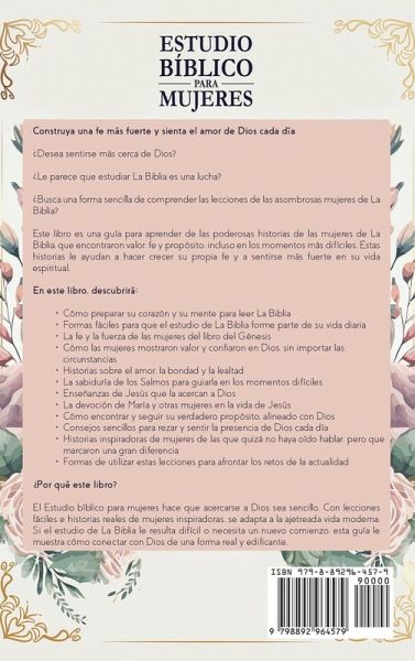 Construya una fe más fuerte y sienta el amor de Dios cada día ¿Desea sentirse más cerca de Dios? ¿Le parece que estudiar La Biblia es una lucha? ¿Busca una forma sencilla de comprender las lecciones de las asombrosas mujeres de La Biblia? Este libro es una guía para aprender de las poderosas historias de las mujeres de La Biblia, que encontraron valor, fe y propósito, incluso en los momentos más difíciles. Estas historias le ayudan a hacer crecer su propia fe y a sentirse más fuerte en su vida espiritual. En este libro, descubrirá: Cómo preparar su corazón y su mente para leer La Biblia Formas fáciles para que el estudio de La Biblia forme parte de su vida diaria La fe y la fuerza de las mujeres del libro del Génesis Cómo las mujeres mostraron valor y confiaron en Dios, sin importar las circunstancias Historias sobre el amor, la bondad y la lealtad La sabiduría de los Salmos para guiarla en los momentos difíciles Enseñanzas de Jesús que la acercan a Dios La devoción de María y otras mujeres en la vida de Jesús Cómo encontrar y seguir su verdadero propósito, alineado con Dios Consejos sencillos para rezar y sentir la presencia de Dios cada día Historias inspiradoras de mujeres de las que quizá no haya oído hablar, pero que marcaron una gran diferencia Formas de utilizar estas lecciones para afrontar los retos de la actualidad ¿Por qué este libro? El Estudio bíblico para mujeres hace que acercarse a Dios sea sencillo. Con lecciones fáciles e historias reales de mujeres inspiradoras, se adapta a la ajetreada vida moderna. Si el estudio de La Biblia le resulta difícil o necesita un nuevo comienzo, esta guía le muestra cómo conectar con Dios de una forma real y edificante. No tiene por qué sentirse perdida o atascada en su viaje espiritual. Con este libro, puede encontrar la fuerza que necesita para hacer crecer su fe y profundizar en su relación con Dios.