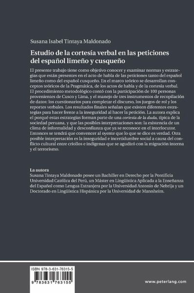 El presente trabajo tiene como objetivo conocer y examinar normas y estrategias que están presentes en el acto de habla de las peticiones tanto del español limeño como del español cusqueño. En el marco teórico se desarrollan conceptos teóricos de la Pragmática, de los actos de habla y de la cortesía verbal. El procedimiento metodológico contó con la participación de 100 personas provenientes de Cusco y Lima, y el manejo de tres instrumentos de recopilación de datos: los cuestionarios para completar el discurso, los juegos de rol y los reportes verbales. Los resultados finales señalan que existen diferentes estrategias para hacer frente a la inseguridad al hacer la petición. La autora explica el porqué estas estrategias forman parte de una cortesía de la duda, típica de la sociedad peruana, y que las posibles interpretaciones son: la existencia de un clima de informalidad y desconfianza que ya se reconoce en el interlocutor. Entonces se tendrá que convencer al oyente que lo que sedice es verdad. Otra posible interpretación es la inseguridad e incertidumbre social a causa del conflicto cultural entre criollos e indígenas que se agudizó con la migración interna y el terrorismo.