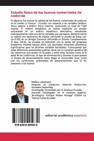 El objetivo fue evaluar la calidad de los huevos comerciales de codorniz en el cantón La Troncal - Ecuador con respecto a las variables (análisis físico externo y análisis físico interno), analizando un total de 1200 huevos. El análisis estadístico se realizó mediante un estudio univariante en un análisis estadístico descriptivo, estudiando individualmente cada una de las variables por parroquia, posteriormente se realizó una separación de medias utilizando la prueba de Tukey con (p<0.05) en un Arreglo Factorial utilizando un Diseño Completamente al Azar (DCA), las pruebas se realizaron con la ayuda del programa estadístico InfoStaf versión 2019. Los resultados mostraron diferencias significativas para las distintas variables estudiadas. Concluyendo que estas diferencias presentadas podrían darse por la variación genética de las codornices que existen en Ecuador y entre otros factores como es la edad de las codornices, el tipo de alimentación y durante la post-puesta el tiempo de almacenamiento hasta llegar al consumidor final, junto con las condiciones ambientales de almacenamiento que se les prestaron a los huevos.