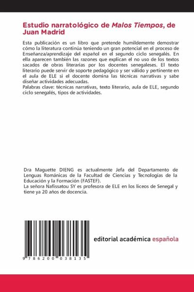 Esta publicación es un libro que pretende humildemente demostrar cómo la literatura continúa teniendo un gran potencial en el proceso de Enseñanza/aprendizaje del español en el segundo ciclo senegalés. En ella aparecen también las razones que explican el no uso de los textos sacados de obras literarias por los docentes senegaleses. El texto literario puede servir de soporte pedagógico y ser válido y pertinente en el aula de ELE si el docente domina las técnicas narrativas y sabe diseñar actividades adecuadas.Palabras clave: técnicas narrativas, texto literario, aula de ELE, segundo ciclo senegalés, tipos de actividades.