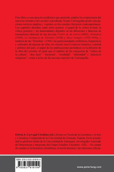 Este libro es una apuesta académica que pretende ampliar la comprensión del universo narrativo del escritor colombiano Tomás Carrasquilla desde concepciones teóricas amplias y vigentes en los estudios literarios contemporáneos. Los capítulos abordan, entre otros asuntos, el papel de la crítica textual, la crítica genética y las humanidades digitales en las difusiones e historias de transmisión editorial de las novelas Frutos de mi tierra (1896), Grandeza (1910), La marquesa de Yolombó (1928) y Hace tiempos (1935-1936), y también de las "Homilías" (1906); las particularidades estilísticas, lingüísticas y culturales de algunas de ellas; su vínculo con el contexto histórico, cultural y político del país; el papel de las publicaciones periódicas en la difusión de la obra del escritor; al igual que el análisis de las categorías de "crítica de la cultura", "don Juan", "memoria", "ruralidad", "urbanidad" y "prácticas religiosas", vistas a la luz de las novelas mayores de Carrasquilla.