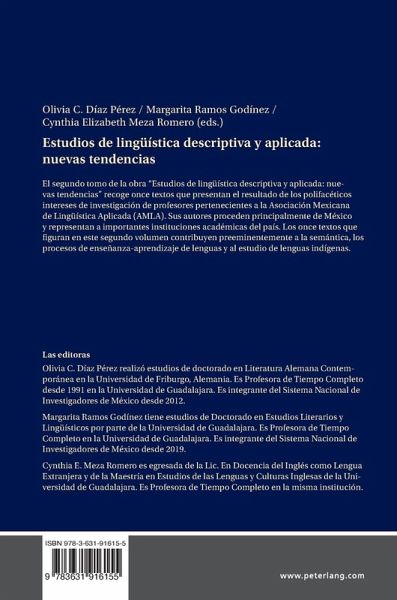 El segundo tomo de la obra "Estudios de lingüística descriptiva y aplicada: nuevas tendencias" recoge once textos que presentan el resultado de los polifacéticos intereses de investigación de profesores pertenecientes a la Asociación Mexicana de Lingüística Aplicada (AMLA). Sus autores proceden principalmente de México y representan a importantes instituciones académicas del país. Los once textos que figuran en este segundo volumen contribuyen preeminentemente a la semántica, los procesos de enseñanza-aprendizaje de lenguas y al estudio de lenguas indígenas.