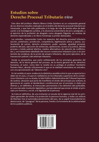 Esta obra del profesor Alberto Blanco-Uribe Quintero es un compendio general de sus diversos estudios realizados en el ámbito del derecho procesal tributario en Venezuela, y que han sido publicados a lo largo de más de treinta años de dedicación a la investigación jurídica, a la docencia universitaria de pre y postgrado, y al ejercicio de la profesión de abogado como abogado litigante, en revistas de derecho especializadas y en libros homenaje a juristas destacados. Los estudios, comprenden todos los aspectos del derecho procesal tributario (acción, pretensión, jurisdicción, competencia, legitimación activa y pasiva, sustanciación de juicios, derecho probatorio, poder cautelar, igualdad procesal, poderes del juez, ejecución de sentencias, apelaciones, acceso a la justicia, debido proceso y tutela judicial efectiva, medios alternativos de solución de conflictos, etc.), con tratamiento detallado del recurso contencioso tributario (con o sin pretensión de condena), de la acción de amparo tributario, del juicio ejecutivo, de la transacción judicial y del arbitraje tributario. Desde su perspectiva, que parte ceñidamente de los principios generales del derecho, de la teoría general del proceso, de la teoría general de los derechos humanos, el autor, como bien lo resalta en su prólogo el profesor Humberto Romero-Muci, aborda críticamente lo que es la realidad venezolana en estrados, con una aproximación de "derecho vivo". En tal sentido el autor evidencia la dialéctica sensible entre lo que se aprecia ha o debe ser en aula, y lo que en realidad es en los tribunales superiores de lo contencioso tributario y en su alzada, la Sala Político-Administrativa del Tribunal Supremo de Justicia, situación que pone de manifiesto el olvido del principio pro actione, la ignorancia en cuanto al desiderátum constitucional por el principio in dubio pro libertas y, en definitiva, el menoscabo permanente a los derechos del justiciable, en una marcada involución legislativa y jurisprudencial que envía al olvido al principio pro homine y, con él, a la dignidad de la persona. Se trata en definitiva, de una invitación al rescate de la vigencia real de los principios generales de tutela a la protección la persona humana, y todas sus esferas de libertad, tras el autoredescubriemiento del juez, de su papel trascendental en democracia, de "paraguas" de la persona, frente a la tormenta de la arbitrariedad de los poderes públicos