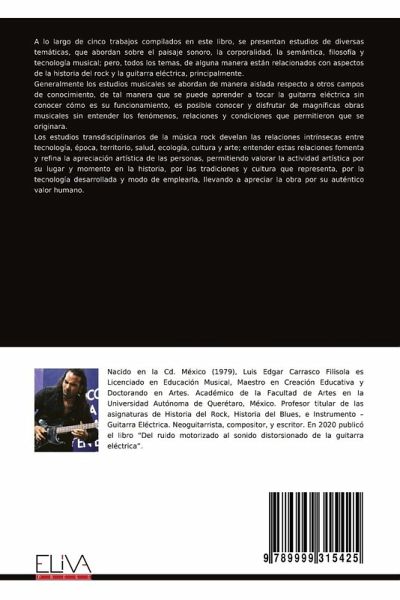 A lo largo de cinco trabajos compilados en este libro, se presentan estudios de diversas temáticas, que abordan sobre el paisaje sonoro, la corporalidad, la semántica, filosofía y tecnología musical; pero, todos los temas, de alguna manera están relacionados con aspectos de la historia del rock y la guitarra eléctrica, principalmente. Generalmente los estudios musicales se abordan de manera aislada respecto a otros campos de conocimiento, de tal manera que se puede aprender a tocar la guitarra eléctrica sin conocer cómo es su funcionamiento, es posible conocer y disfrutar de magníficas obras musicales sin entender los fenómenos, relaciones y condiciones que permitieron que se originara. Los estudios transdisciplinarios de la música rock develan las relaciones intrínsecas entre tecnología, época, territorio, salud, ecología, cultura y arte; entender estas relaciones fomenta y refina la apreciación artística de las personas, permitiendo valorar la actividad artística por su lugar y momento en la historia, por las tradiciones y cultura que representa, por la tecnología desarrollada y modo de emplearla, llevando a apreciar la obra por su auténtico valor humano.