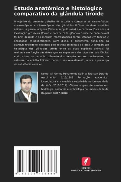 O objetivo do presente trabalho foi estudar e comparar as caraterísticas macroscópicas e microscópicas das glândulas tiróides de duas espécies animais, a gazela indígena (Gazella subgutturosa) e o carneiro (Ovis aris). A localização grosseira (forma e cor) de cada glândula tiroide de cada animal foi bem descrita e as medidas macroscópicas foram listadas em tabelas e analisadas estatisticamente. Além disso, o suprimento sanguíneo da glândula tireoide foi realizado pela técnica de injeção de látex. A comparação histológica das glândulas tiroide entre as duas espécies animais foi realizada em função das diferenças na espessura das cápsulas dos lóbulos e do istmo, do tamanho diferente dos folículos no seu parênquima, da natureza do epitélio folicular, como o seu revestimento, altura e presença de substância coloidal.