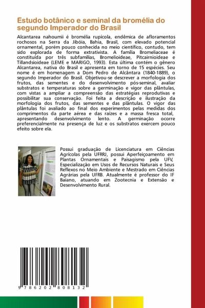 Alcantarea nahoumii é bromélia rupícola, endêmica de afloramentos rochosos na Serra da Jibóia, Bahia, Brasil, com elevado potencial ornamental, porém pouco conhecida no meio científico, contudo, tem sido explorada de forma extrativista. A família Bromeliaceae é constituída por três subfamílias, Bromelioideae, Pitcairnioideae e Tillandsioideae (LEME e MARIGO, 1993). Esta última contém o gênero Alcantarea, nativa do Brasil e apresenta em torno de 15 espécies. Seu nome é em homenagem a Dom Pedro de Alcântara (1840-1889), o segundo Imperador do Brasil. Objetivou-se descrever a morfologia dos frutos, das sementes e do desenvolvimento pós-seminal, avaliar substratos e temperaturas sobre a germinação e vigor das plântulas, com vistas a ampliar a compreensão das estratégias reprodutivas e possibilitar sua conservação. Foi feita a descrição e ilustração da morfologia dos frutos, das sementes e das plântulas. O vigor das plântulas foi avaliado ao final dos experimentos pelas medidas dos comprimentos da parte aérea e das raízes e a massa fresca total, apresentando desenvolvimento lento. A germinação ocorre preferencialmente na presença de luz e os substratos exercem pouco efeito sobre ela.