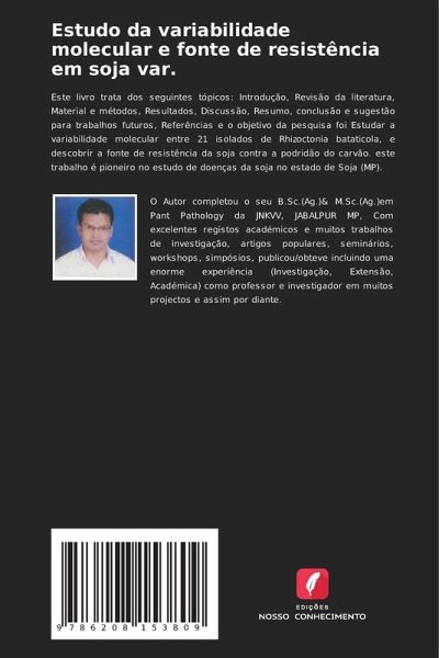 Este livro trata dos seguintes tópicos: Introdução, Revisão da literatura, Material e métodos, Resultados, Discussão, Resumo, conclusão e sugestão para trabalhos futuros, Referências e o objetivo da pesquisa foi Estudar a variabilidade molecular entre 21 isolados de Rhizoctonia bataticola, e descobrir a fonte de resistência da soja contra a podridão do carvão. este trabalho é pioneiro no estudo de doenças da soja no estado de Soja (MP).