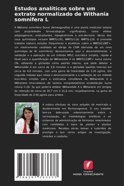 A Withania somnifera Dunal (Ashwagandha) é uma planta medicinal indiana com propriedades farmacológicas significativas, como efeitos adaptogénicos, antioxidantes, hipoglicémicos e anti-derrame. Vários dos seus quimiotipos incluem NMITLI-101, NMITLI-118, NMITLI-128. O presente trabalho elabora estudos fitoquímicos e analíticos sobre o NMITLI118RT+, um medicamento candidato ao abrigo do CSIR (derivado de um novo quimiotipo de W. somnifera). Apresentamos aqui o desenvolvimento, a validação e a aplicação de um método HPLC isocrático simples, rápido e fiável para a quantificação da Withanolide A no NMITLI118RT+ numa coluna CN, utilizando a gliclazida como padrão interno, que pode detetar a Withanolide A em cerca de 3,8 minutos e a gliclazida (padrão interno) em cerca de 4,8 minutos, com uma gama de linearidade de 2-20 µg/mL. Um segundo método aqui relata o desenvolvimento e a validação de um método isocrático simples para a estimativa simultânea de Withanolide A e Withanone (marcadores de lactona sesquiterpénica) estabelecido numa coluna C-18; 3µ que poderia detetar Withanolide A e Withanone em tempos de retenção de cerca de 20,7 min e 21,6 min, respetivamente, na gama de linearidade de 2-50 µg/mL para ambos.