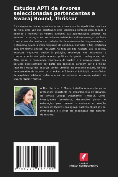 Os espaços verdes urbanos mereceram uma atenção significativa nos dias de hoje, uma vez que constituem uma tecnologia rentável para reduzir a poluição e melhorar os valores estéticos das aglomerações urbanas. No entanto, os espaços verdes urbanos existentes sofrem ameaças notáveis como a invasão devido a actividades de desenvolvimento, fragmentações e isolamento devido à implementação de condutas, estradas e fios eléctricos que, em última análise, resultam na redução dos habitats das espécies, impactos negativos devido à poluição, mudanças nas respostas e comportamento dos polinizadores, práticas de gestão inadequadas, etc. Além disso, a consciência incompleta do público e a subvalorização dos serviços ecosistémicos por parte dos decisores parecem ser o principal fator de ameaça dos espaços verdes urbanos. No presente estudo, foi feita uma tentativa de monitorizar o Índice de Tolerância à Poluição Atmosférica de espécies arbóreas seleccionadas pertencentes à cintura exterior de Swaraj round, Thrissur.