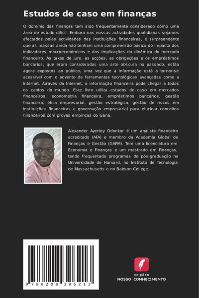 O domínio das finanças tem sido frequentemente considerado como uma área de estudo difícil. Embora nas nossas actividades quotidianas sejamos afectados pelas actividades das instituições financeiras, é surpreendente que as massas ainda não tenham uma compreensão básica do impacto dos indicadores macroeconómicos e das implicações da dinâmica do mercado financeiro. As taxas de juro, as acções, as obrigações e os empréstimos bancários, que eram considerados uma arte obscura no passado, estão agora expostos ao público, uma vez que a informação está a tornar-se acessível com o advento de ferramentas tecnológicas avançadas como a Internet. Através da Internet, a informação financeira pode chegar a todos os cantos do mundo. Este livro utiliza estudos de caso em mercados financeiros, econometria financeira, empréstimos bancários, gestão financeira, ética empresarial, gestão estratégica, gestão de riscos em instituições financeiras e governação empresarial para elucidar conceitos financeiros com provas empíricas do Gana.