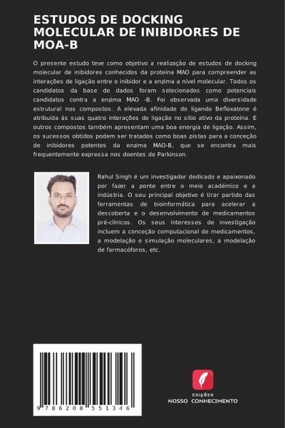 O presente estudo teve como objetivo a realização de estudos de docking molecular de inibidores conhecidos da proteína MAO para compreender as interações de ligação entre o inibidor e a enzima a nível molecular. Todos os candidatos da base de dados foram selecionados como potenciais candidatos contra a enzima MAO -B. Foi observada uma diversidade estrutural nos compostos. A elevada afinidade do ligando Befloxatone é atribuída às suas quatro interações de ligação no sítio ativo da proteína. E outros compostos também apresentam uma boa energia de ligação. Assim, os sucessos obtidos podem ser tratados como boas pistas para a conceção de inibidores potentes da enzima MAO-B, que se encontra mais frequentemente expressa nos doentes de Parkinson.