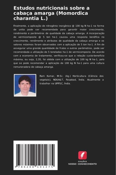 Finalmente, a aplicação de nitrogênio inorgânico @ 100 kg N ha-1 na forma de uréia pode ser recomendada para garantir maior crescimento, rendimento e parâmetros de qualidade da cabaça amarga. A incorporação de vermicomposto @ 5 ton ha-1 causou uma resposta benéfica no crescimento, rendimento e atributos de qualidade da cabaça amarga e os valores máximos foram observados com a aplicação de 5 ton ha-1. A fim de assegurar uma grande quantidade de frutos e outros parâmetros, pode ser recomendada a utilização de 5 toneladas ha-1 de vermicomposto. De acordo com a economia de tratamento, verificou-se que a relação custo-benefício máxima, ou seja, 2,35, foi obtida com a utilização de 100 kg N ha-1, pelo que se pode recomendar a aplicação de 100 kg N ha-1 para uma cultura remuneradora de cabaça amarga.