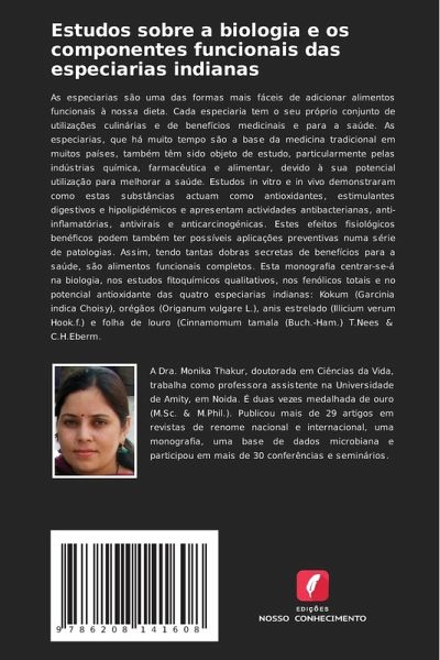 As especiarias são uma das formas mais fáceis de adicionar alimentos funcionais à nossa dieta. Cada especiaria tem o seu próprio conjunto de utilizações culinárias e de benefícios medicinais e para a saúde. As especiarias, que há muito tempo são a base da medicina tradicional em muitos países, também têm sido objeto de estudo, particularmente pelas indústrias química, farmacêutica e alimentar, devido à sua potencial utilização para melhorar a saúde. Estudos in vitro e in vivo demonstraram como estas substâncias actuam como antioxidantes, estimulantes digestivos e hipolipidémicos e apresentam actividades antibacterianas, anti-inflamatórias, antivirais e anticarcinogénicas. Estes efeitos fisiológicos benéficos podem também ter possíveis aplicações preventivas numa série de patologias. Assim, tendo tantas dobras secretas de benefícios para a saúde, são alimentos funcionais completos. Esta monografia centrar-se-á na biologia, nos estudos fitoquímicos qualitativos, nos fenólicos totais e no potencial antioxidante das quatro especiarias indianas: Kokum (Garcinia indica Choisy), orégãos (Origanum vulgare L.), anis estrelado (Illicium verum Hook.f.) e folha de louro (Cinnamomum tamala (Buch.-Ham.) T.Nees & C.H.Eberm.