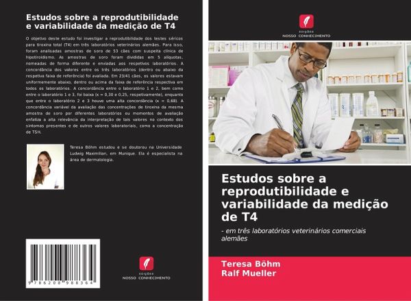 O objetivo deste estudo foi investigar a reprodutibilidade dos testes séricos para tiroxina total (T4) em três laboratórios veterinários alemães. Para isso, foram analisadas amostras de soro de 53 cães com suspeita clínica de hipotiroidismo. As amostras de soro foram divididas em 5 alíquotas, nomeadas de forma diferente e enviadas aos respetivos laboratórios. A concordância dos valores entre os três laboratórios (dentro ou abaixo da respetiva faixa de referência) foi avaliada. Em 23/41 cães, os valores estavam uniformemente abaixo, dentro ou acima da faixa de referência respectiva em todos os laboratórios. A concordância entre o laboratório 1 e 2, bem como entre o laboratório 1 e 3, foi baixa (¿ = 0,30 e 0,25, respetivamente), enquanto que entre o laboratório 2 e 3 houve uma alta concordância (¿ = 0,68). A concordância variável da avaliação das concentrações de tiroxina da mesma amostra de soro por diferentes laboratórios ou momentos de avaliação enfatiza a alta relevância da interpretação de tais valores no contexto dos sintomas presentes e de outros valores laboratoriais, como a concentração de TSH.