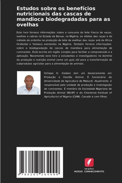 Este livro fornece informações sobre o consumo de leite fresco de vacas, ovelhas e cabras no Estado de Benue, na Nigéria, os efeitos das raças e do método de ordenha na produção de leite de ovelhas das raças anã da África Ocidental e Yankasa existentes na Nigéria. Também fornece informações sobre a biodegradação de cascas de mandioca para alimentação de ruminantes. Está escrito em inglês simples para facilitar a compreensão e a aplicação. Recomendo este livro a estudantes e investigadores no domínio da produção e nutrição animal como um guia útil para a transformação de subprodutos agrícolas para a alimentação de animais.