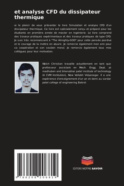 ai le plaisir de vous présenter le livre Simulation et analyse CFD d'un dissipateur thermique. Ce livre est spécialement conçu et préparé pour les étudiants en première année de master en ingénierie. Le livre comprend des travaux pratiques expérimentaux et des travaux pratiques de type CFD. Je suis très reconnaissant à "The Almighty-GOD" pour cette pensée positive et le courage de la mettre en oeuvre. Je remercie également mon ami pour sa coopération et son soutien moral. Je remercie également tous mes collègues pour leur motivation.