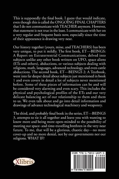 This is supposedly the final book. I guess that would indicate, even though this is called the Ongoing Final Chapters, that I do not communicate with Teacher anymore. However, that statement is not true in the least. I communicate with her on a very regular and frequent basis now, especially since the time of their appearance is drawing very near. Our history together (yours, mine, and Teachers) has been very unique, to put it mildly. The first book, ETBeings: A Report on Extraterrestrial Communications, delved into subjects unlike any other book written on UFO, space aliens (ETs and others), abductions, or various subjects dealing with religions, math, languages, advanced technology, and even cattle abductions. The second book, ETBeings 2: A Textbook, went into far deeper detail about subjects just mentioned in book 1 and even covers in detail a lot of subjects never mentioned before. Some of these pieces of information can be and will be considered very alarming and even scary. This includes the physical and psychological profiles of the ETs and our very delicate balancing act of our relationship to them and them to us. We even talk about and go into detail information and drawings of advance technological machinery and weaponry. The third, and probably final book in the series, ETBeings 3, attempts to tie it all together and leave you with wanting to know more and being more open-minded to the possibility of meeting our space- and time-travelling brethren in the very near future. To me, that will be a glorious, chaotic dayno more cover-up and no more denial, not by our governments nor our religions. What if?